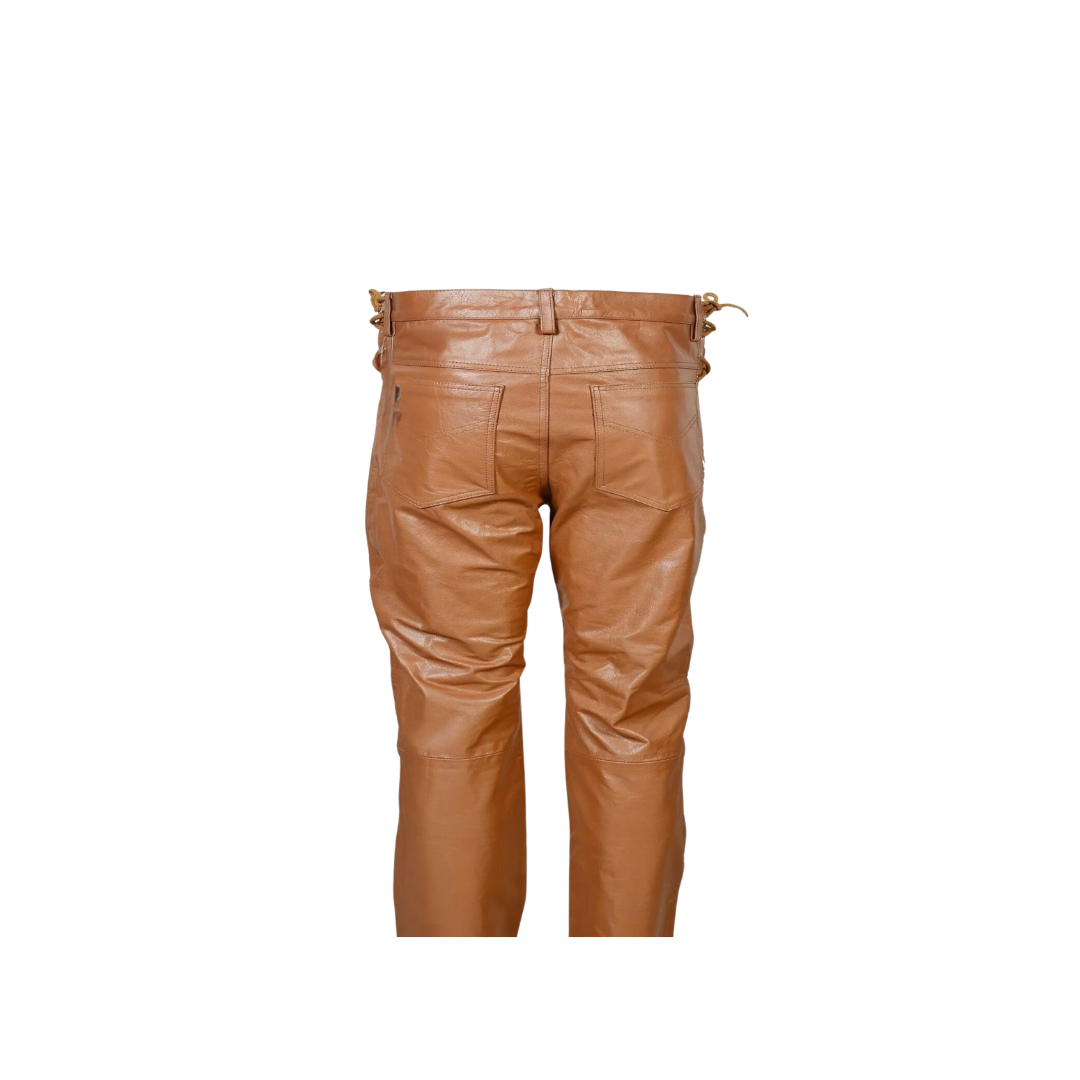 Rev up your style with these Brown Leather Biker Pants featuring side laces. Enjoy the perfect blend of edgy and classic with these pants that add a touch of rebellion to any outfit. Made with high-quality leather, these pants are sure to turn heads (and wheels) wherever you go. Get ready to ride in style!