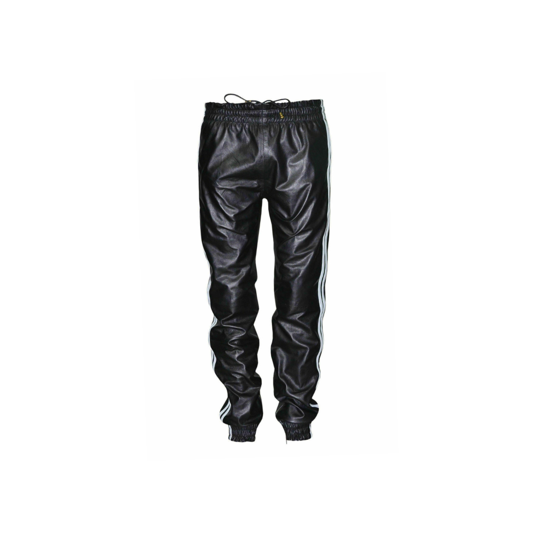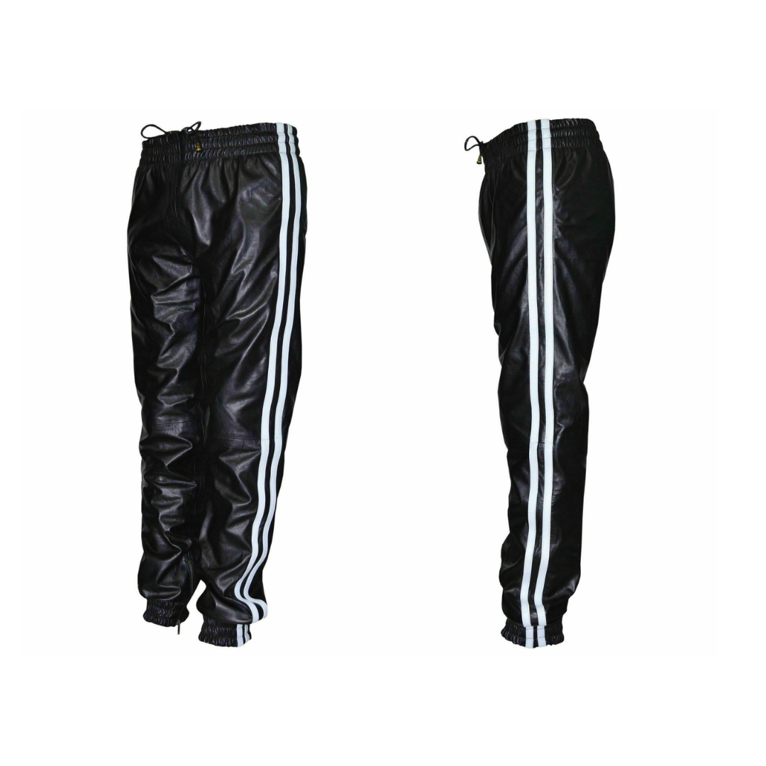 Elevate your style game with our Leather Black Strip Pant. Crafted from genuine leather, this slim fit trouser adds a touch of sophistication to any outfit. The black strip detail adds a stylish and modern twist, making it a must-have for the fashion-forward man. (Pants, meet your match.)