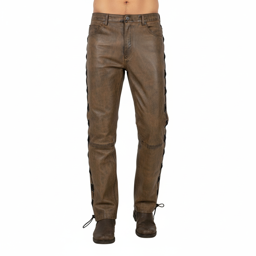 The rich, dirty brown hue and distinctive side laces offer a rugged, timeless aesthetic that pairs perfectly with your favorite biker jacket. Whether you’re cruising down the highway or heading to a rock concert, these pants will make you feel confident and effortlessly cool. We didn’t just focus on style; we obsessed over the details.