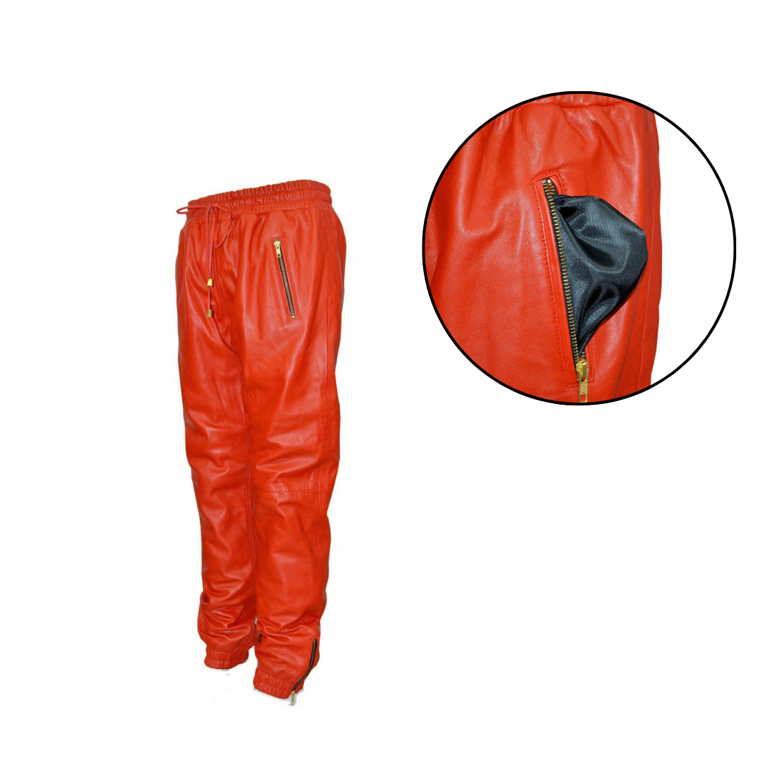 Upgrade your wardrobe with these Men Jogger Red Real Soft Leather Pants. Indulge in premium comfort and style with these genuine leather pants. Perfect for a trendy and edgy look, these pants will elevate any outfit. Get yours now and stand out from the crowd!