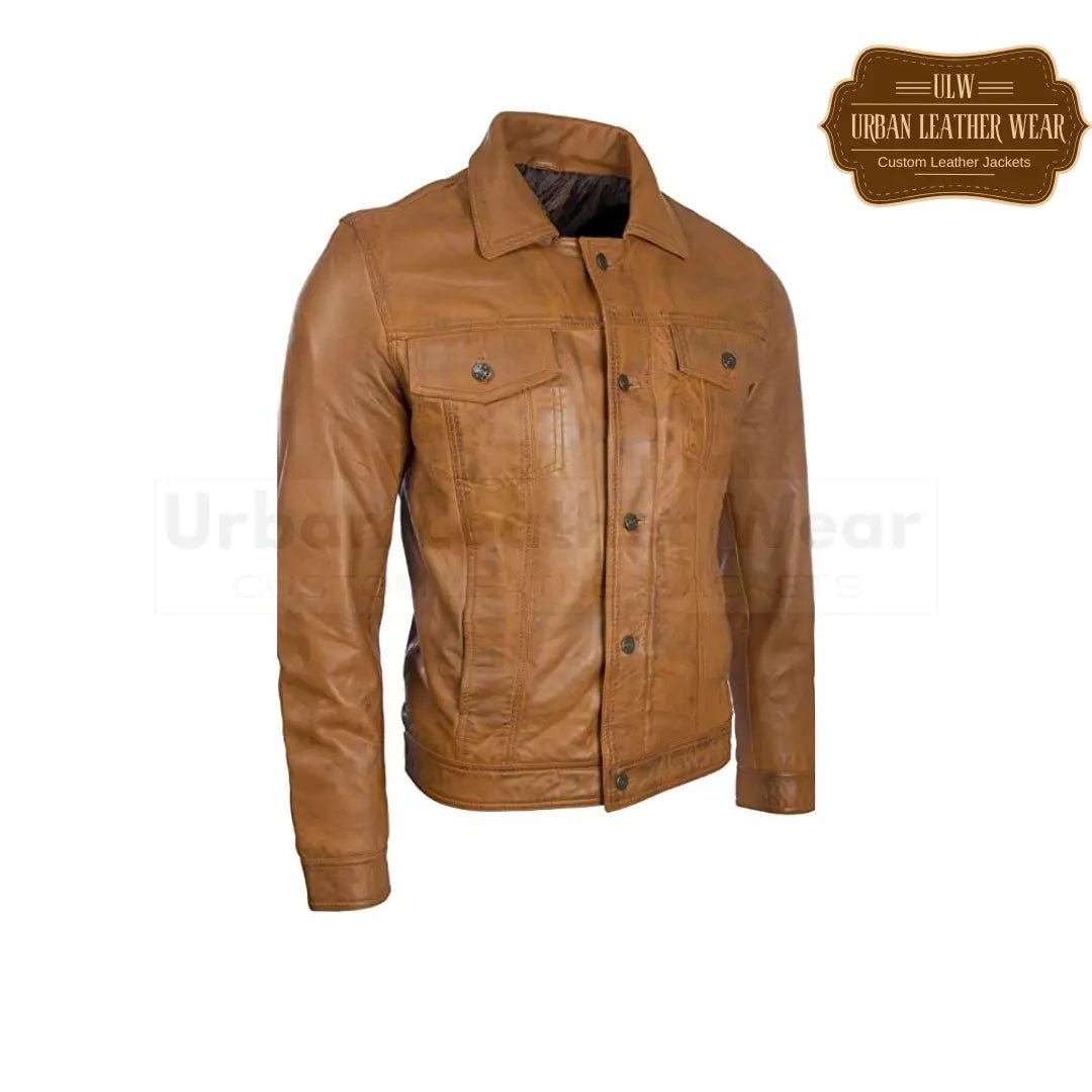Elevate your style with our Men Leather Trucker Jacket in black and tan! This high-quality jacket features luxurious leather for a sleek and edgy look. Stay warm and stylish with this must-have addition to your wardrobe. Upgrade your outerwear game today!