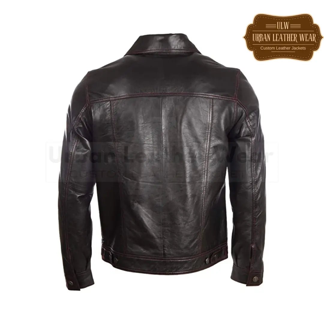 Elevate your style with this Men Real Leather Classic Trucker Fashion Jacket featuring a bold black and red stitch design. Made with real leather, this jacket exudes confidence and durability. Stand out from the crowd and make a statement with this must-have piece!