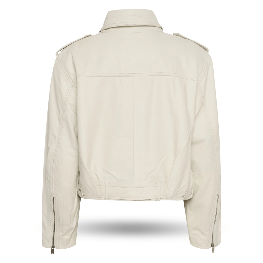 This oversized biker jacket is expertly crafted from processed cowhide leather, selected for its distinct characteristics and visual appeal. The material offers a refined texture and a consistent finish, providing a robust yet pliable structure suitable for outerwear. The white hue is achieved through a specialized finishing process, creating a bright, uniform surface that maintains its integrity and contributes to the jacket’s bold aesthetic.