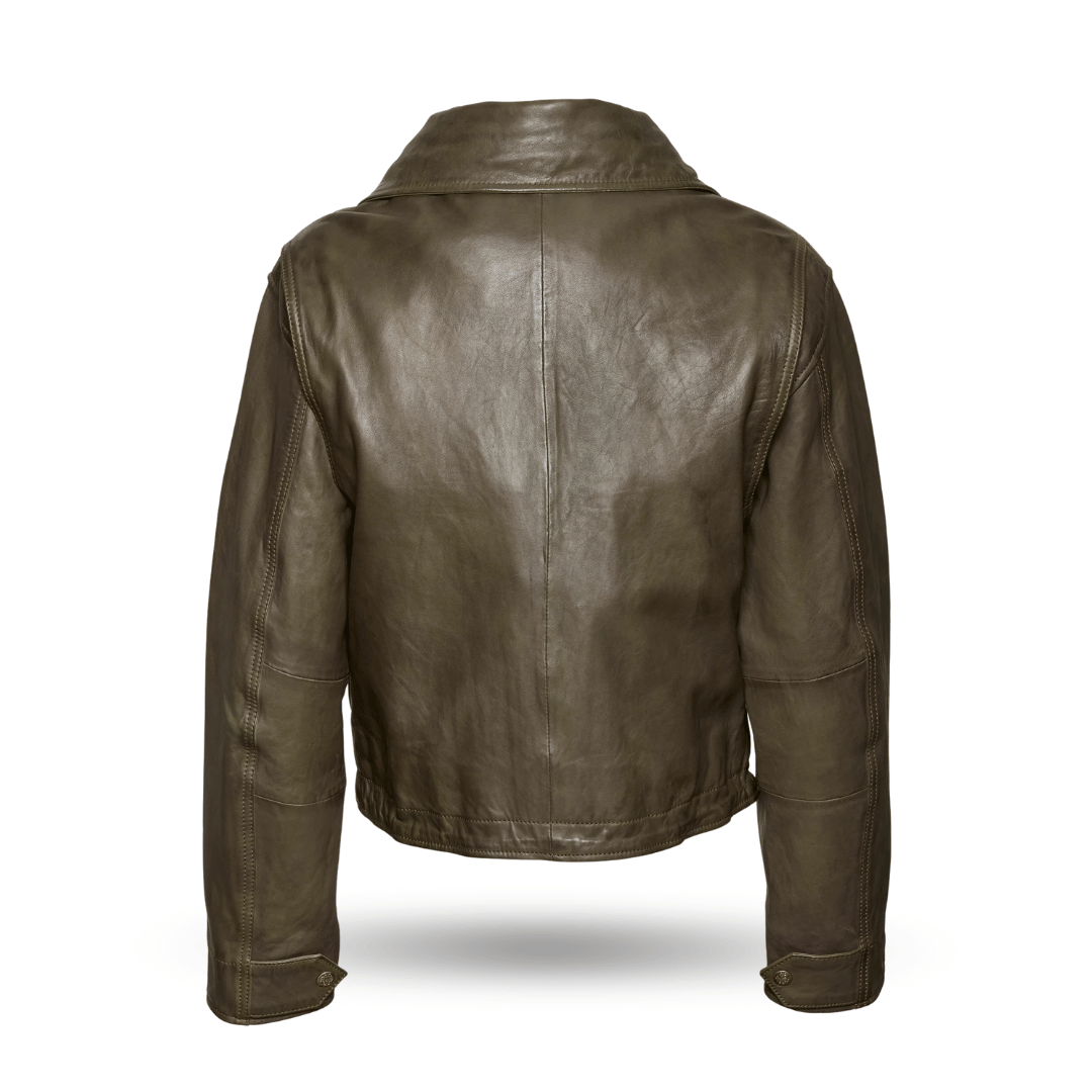 What is the aesthetic appeal of the olive color in this leather jacket?
