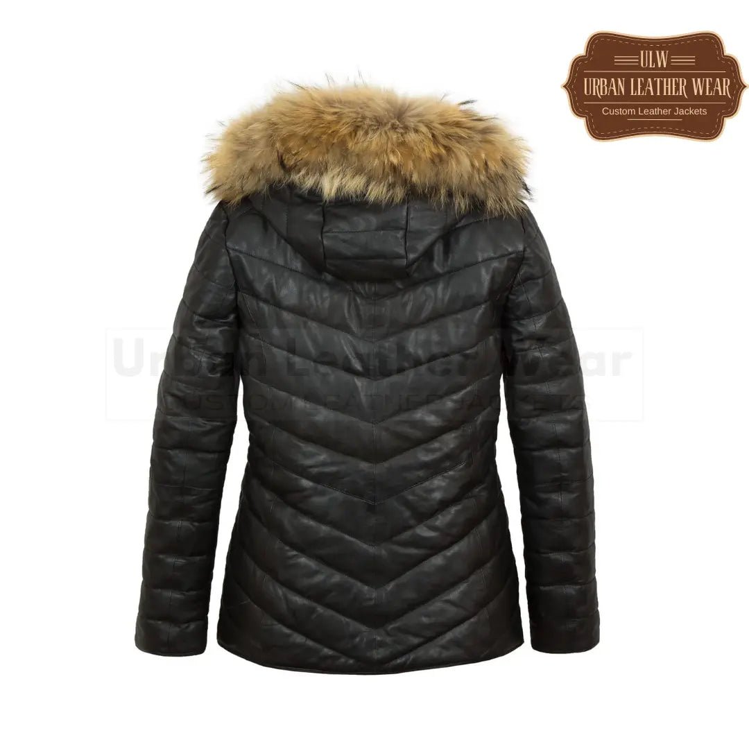 Luxurious women’s black leather padded coat featuring a stylish hood for added warmth and protection. Perfect for cold weather, this stylish and durable jacket is a must-have for your winter wardrobe.