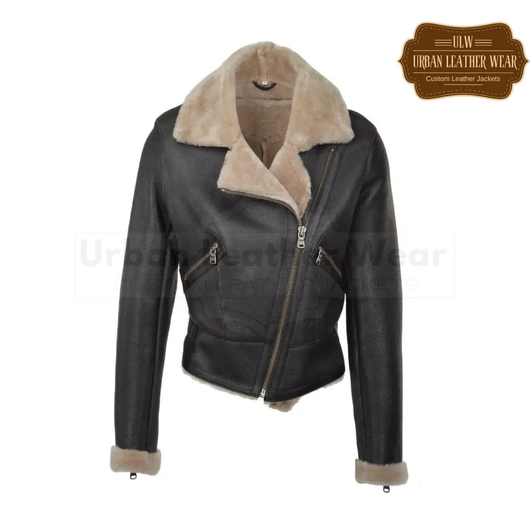 Shop our Women Black Shearling Leather Fur Moto Biker Jacket. Made with high-quality Leather, this jacket features a sleek brown leather exterior, soft shearling lining, and cozy fur collar. Perfect for both fashion and function, it’s a must-have for any winter wardrobe.