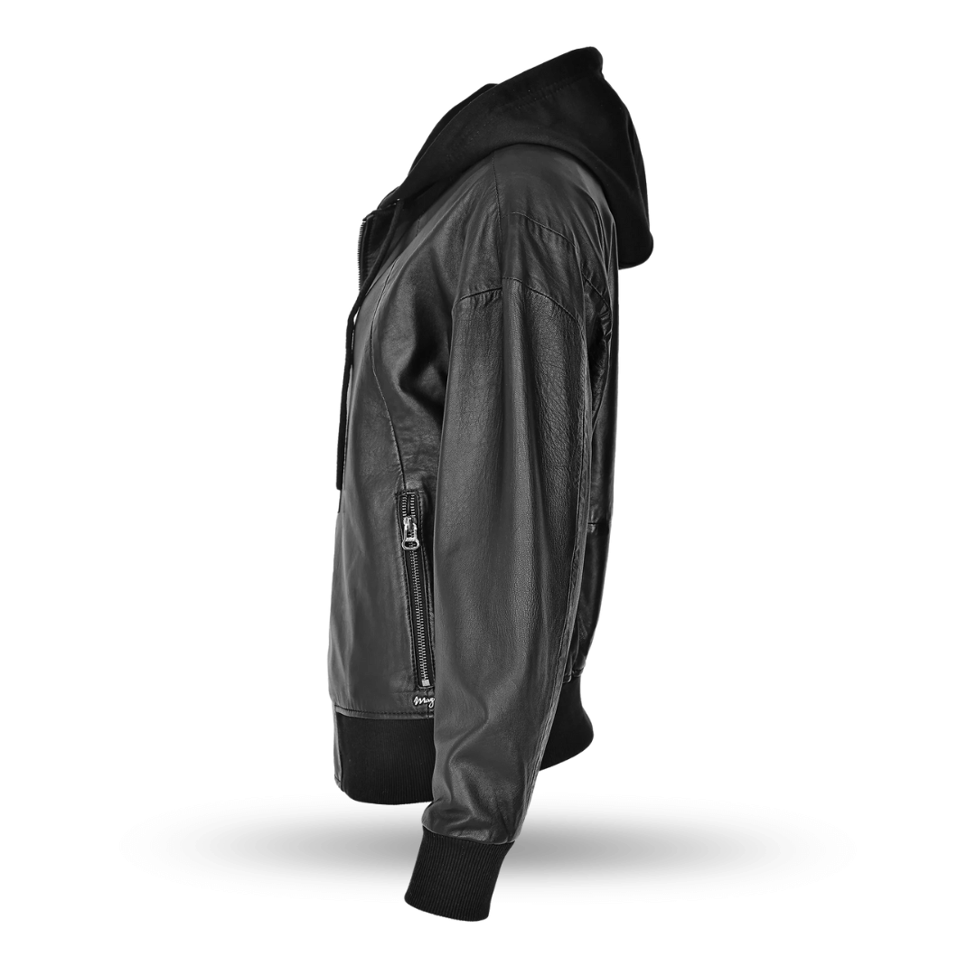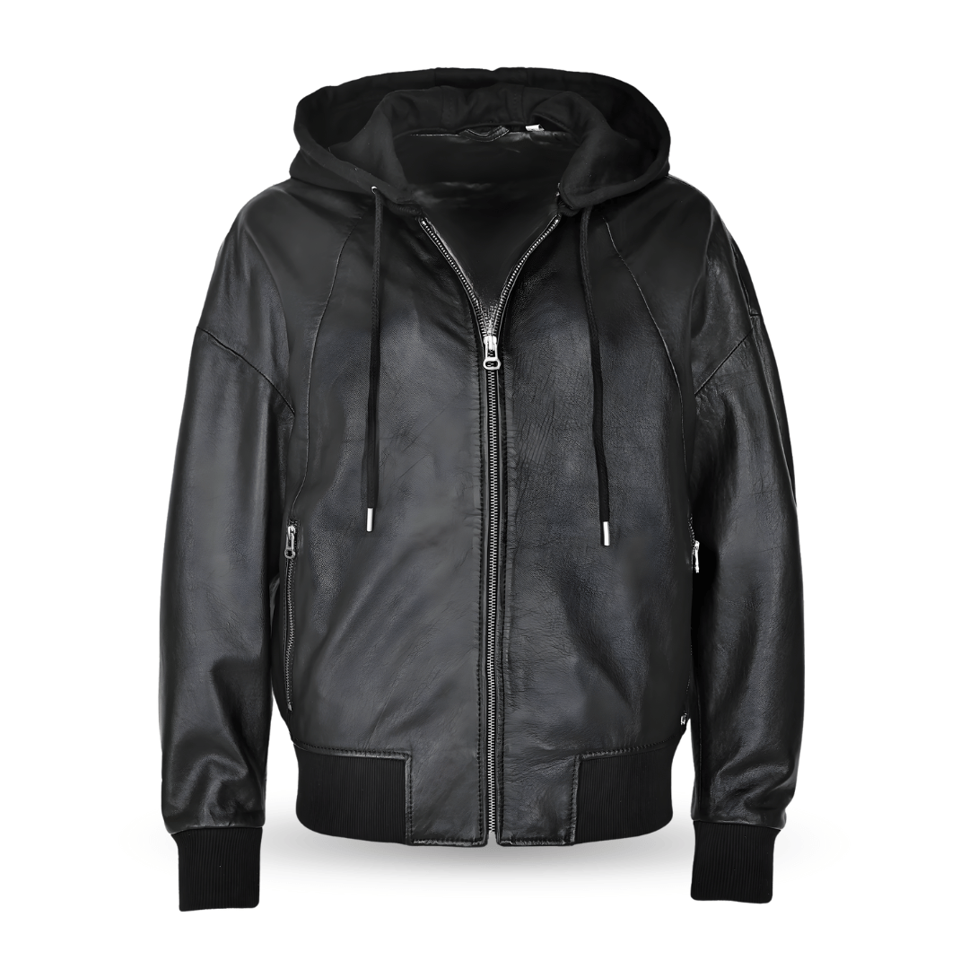 Women’s Black Oversized Bomber Leather Jacket with Hoodie: Material & Finish